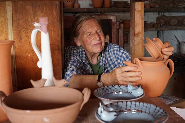 Elisabeth uses red earthenware body fired to 1100ºC. Work is decorated with simple animal and bird drawings. Hot wax is painted over first glaze layer then piece is dipped in another glaze colour. During firing the wax burns away leaving outlines which move with the shape of the piece.